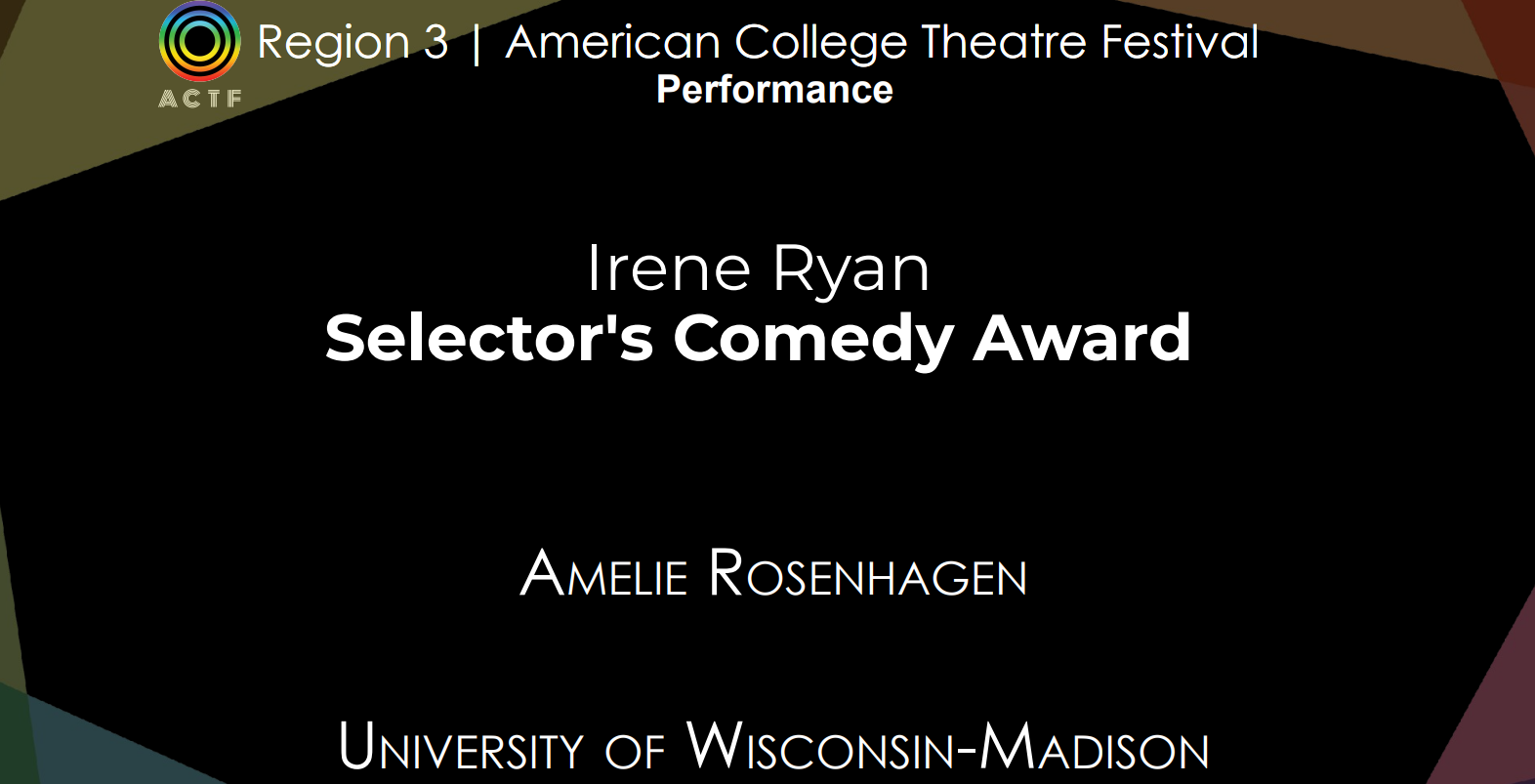 Last week, several students from the Department of Theatre and Drama participated in the American College Theatre Festival (ACTF) for Region 3 representing Illinois, Indiana, Michigan, Wisconsin, and Western Ohio. The festival was held at Madison College and featured performances in venues around the community including the Mitchell and Hemsley Theatres in Vilas Hall at UW.